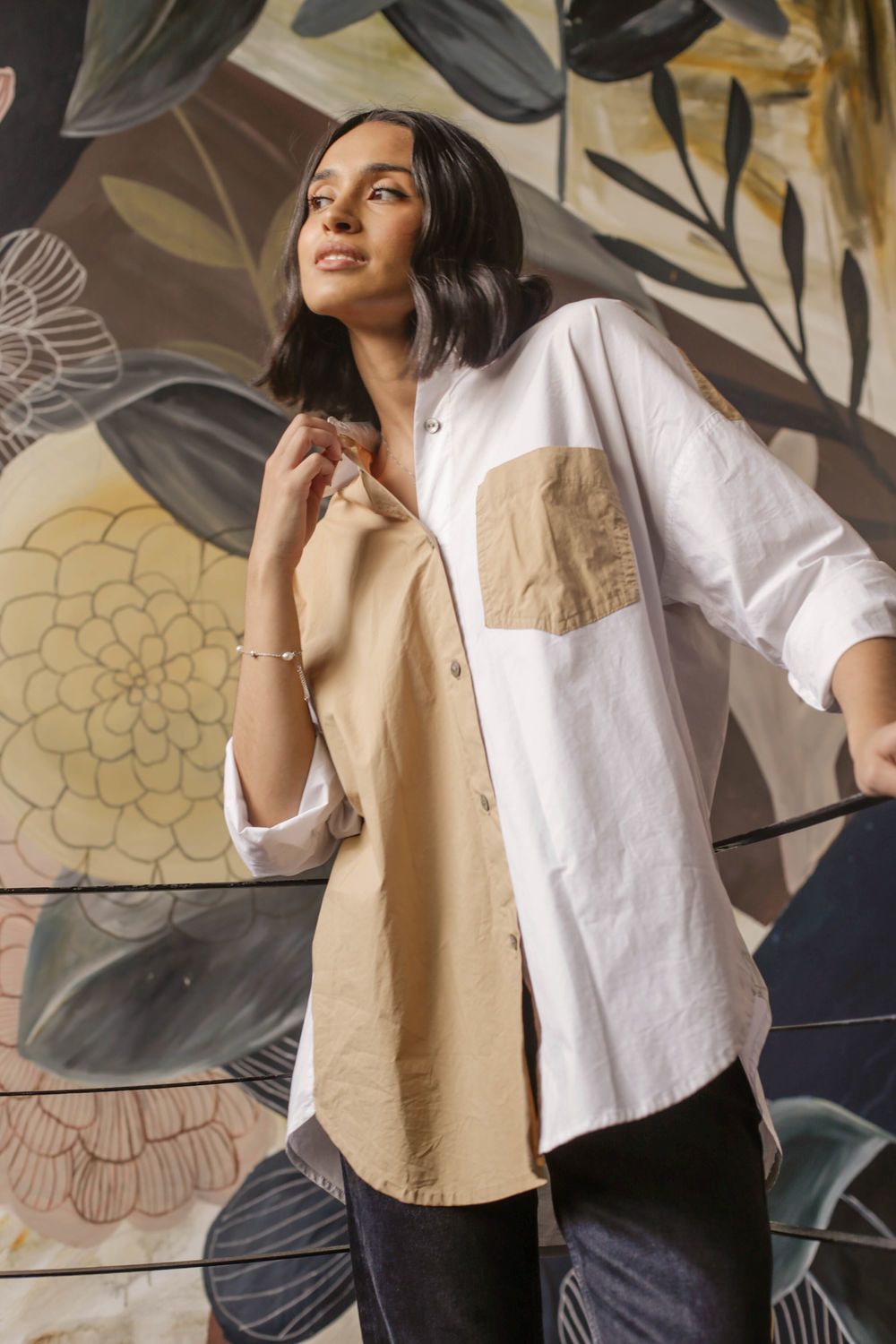 Camisa en popelina de algodón con mezcla de otras fibras. Textura super liviana. De cortes muy amplios. Combinada en dos colores.